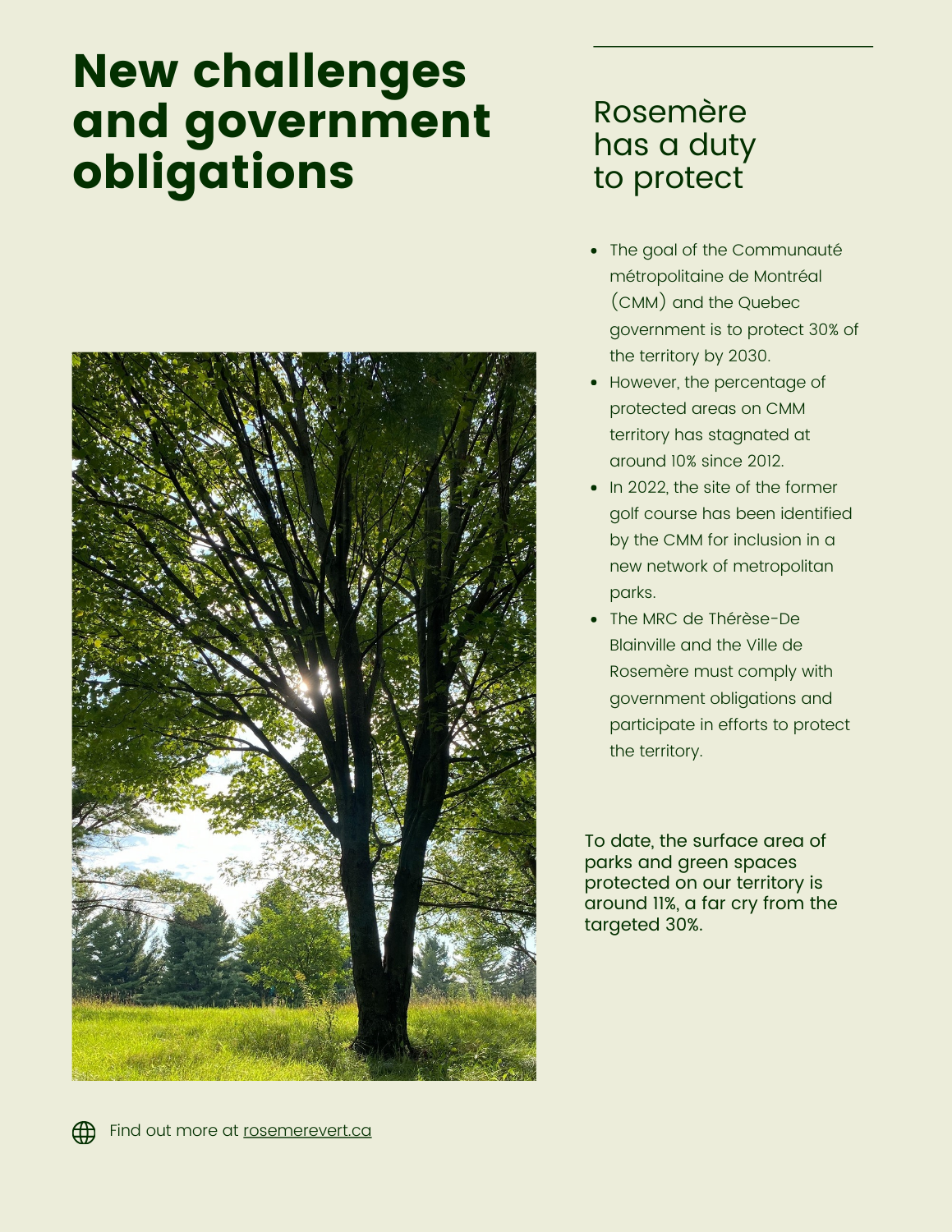 The Town of Rosemère must comply with and participate in land protection efforts. To date, the surface area of parks and green spaces on our territory is 11.5%, according to the statistics given on the town's website, which is far from the targeted 30%.